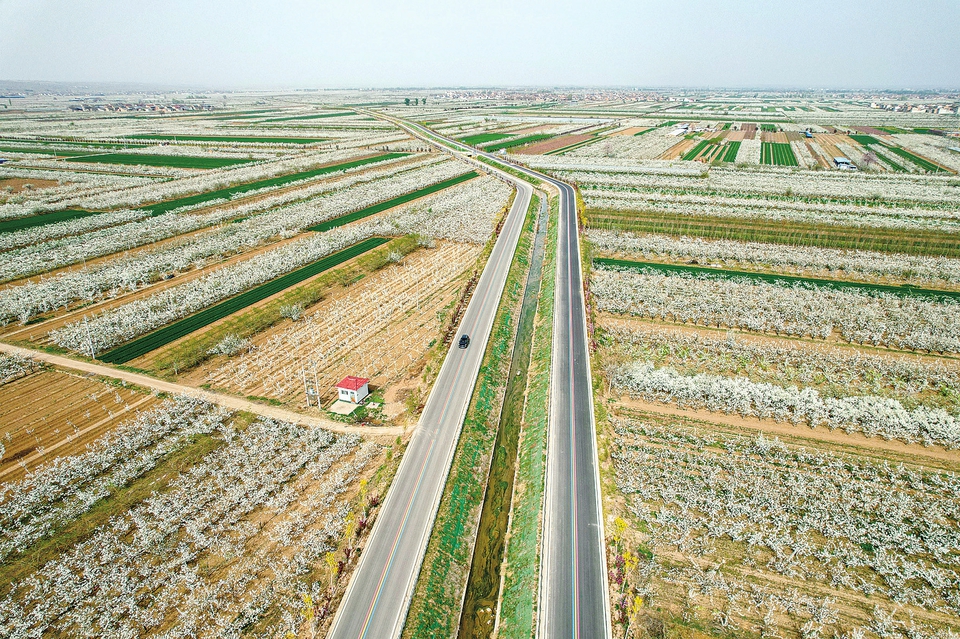 在涑水河旅游路临猗段,汽车缓缓驶过。眼下正值春季,这里的万亩梨花竞相开放,仿佛大地披上了一层洁白的纱衣。蜿蜒的公路穿过这片花海,与周边的绿色麦田、现代化温室大棚以及远处若隐若现的村庄构成一幅和谐美丽的画卷。