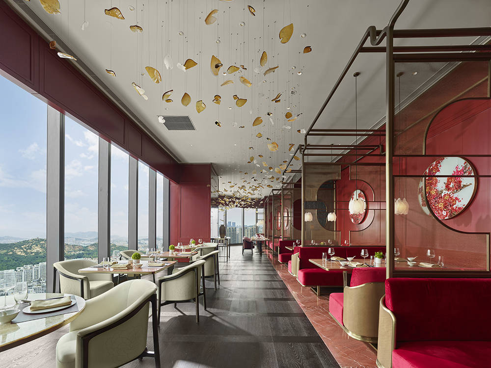 51层的芳菲苑作为府邸的“客厅”,270度无遮挡视野将城市与山海尽收眼底,宝蓝色大理石与午夜蓝墙面相映,刺绣耐冬花瓣点缀其间,展现中式优雅。凭窗可览天光流转,晨晖、暮霭、星夜景致各异,正因这份一日四时的景致变幻,凝练出“山海十二时辰”的独特亮点 —— 晨光里的清润晨食,正午时的鲜爽简餐,午后的雅致茶点,蓝调时刻里的特调鸡尾酒,让每一餐都与窗外景致形成奇妙呼应。